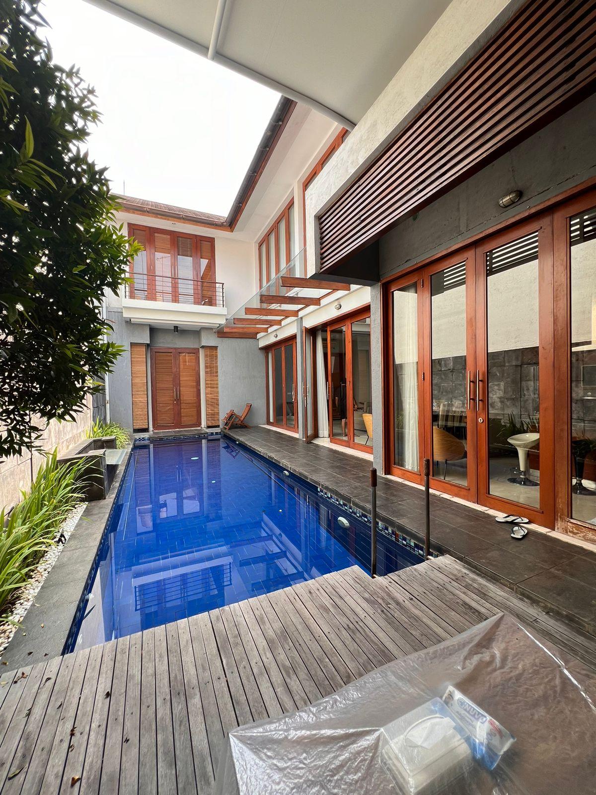 LT. 409m2 LB. 370m2 2 lantai 4+2 kt 3+1km Service area luas(kt art, laundry room,dll) Powder room Swimming pool Garasi 2 mobil Carport 2 mobil Tanah kotak Jalan depan lebar SHM Code : RT